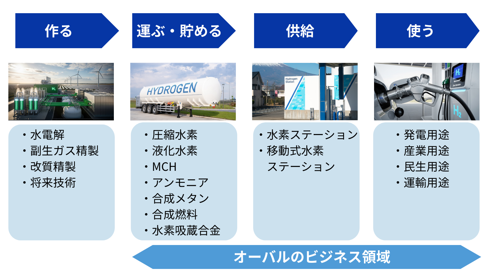 当社は、「ためる・はこぶ」「つかう」の領域で水素社会の実現に貢献してまいります。
