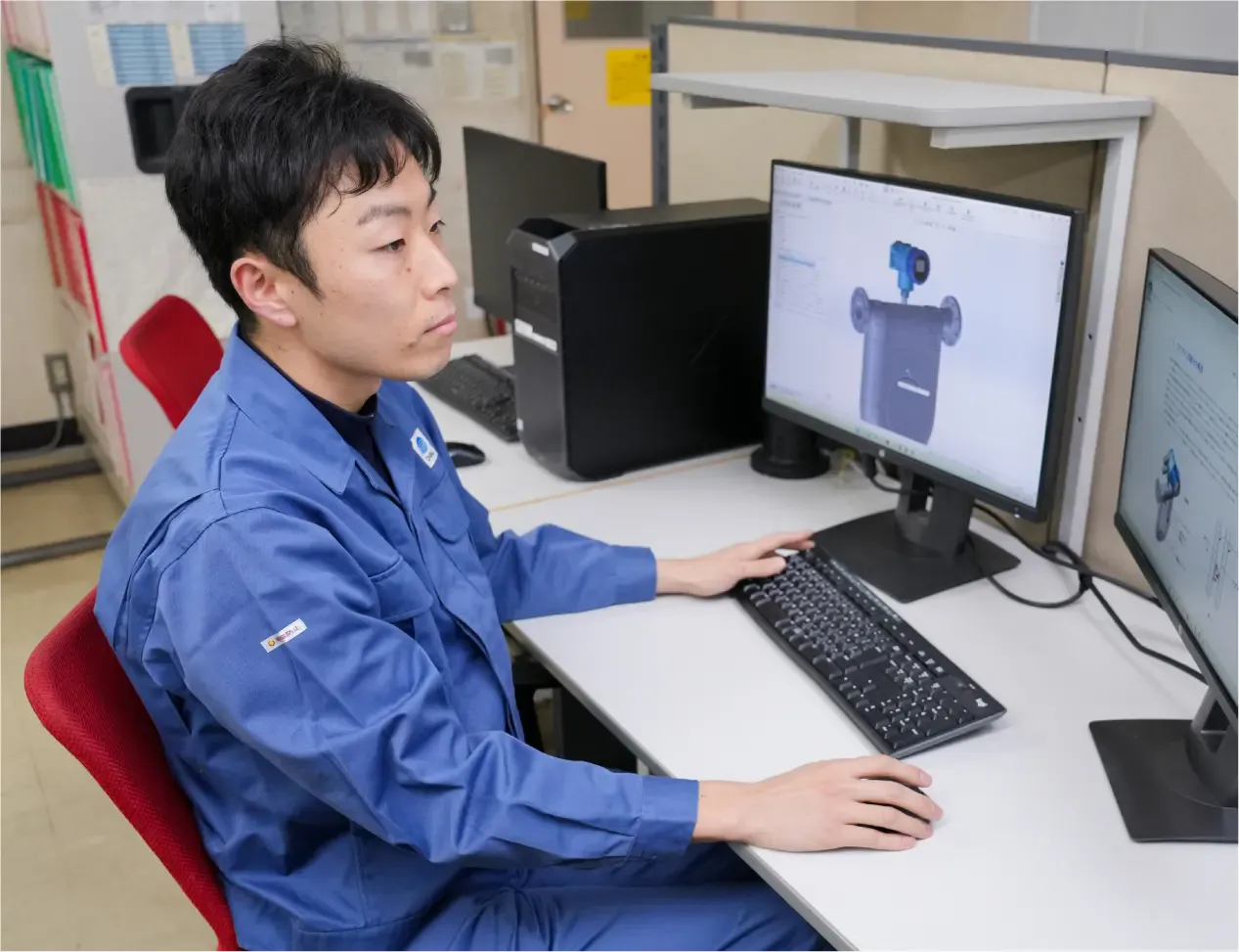 私は技術部として、標準製品の応用設計や新製品の設計、不具合要因の調査、営業やお客様から寄せられる技術的な問い合わせ対応など、製品に関わる幅広い業務を担当しています。問い合わせ内容は、図面の読み取りや仕様確認といった基本的なものから、「この条件で使えないか」「現場の制約を踏まえて何とかならないか」といった判断の難しいものまでさまざまです。技術部の立場として常に意識しているのは、「私たちができないと言うことは、会社としてできないと言っているのと同じだ」という責任です。だからこそ、即答せずに条件を整理し、他部署とも相談しながら、技術的に可能な線を探ります。実現が難しい場合でも、その理由をどう説明すれば理解してもらえるのか、代替案はないのかを考え抜く。その一つひとつの判断が、オーバルの信頼につながっていると感じています。